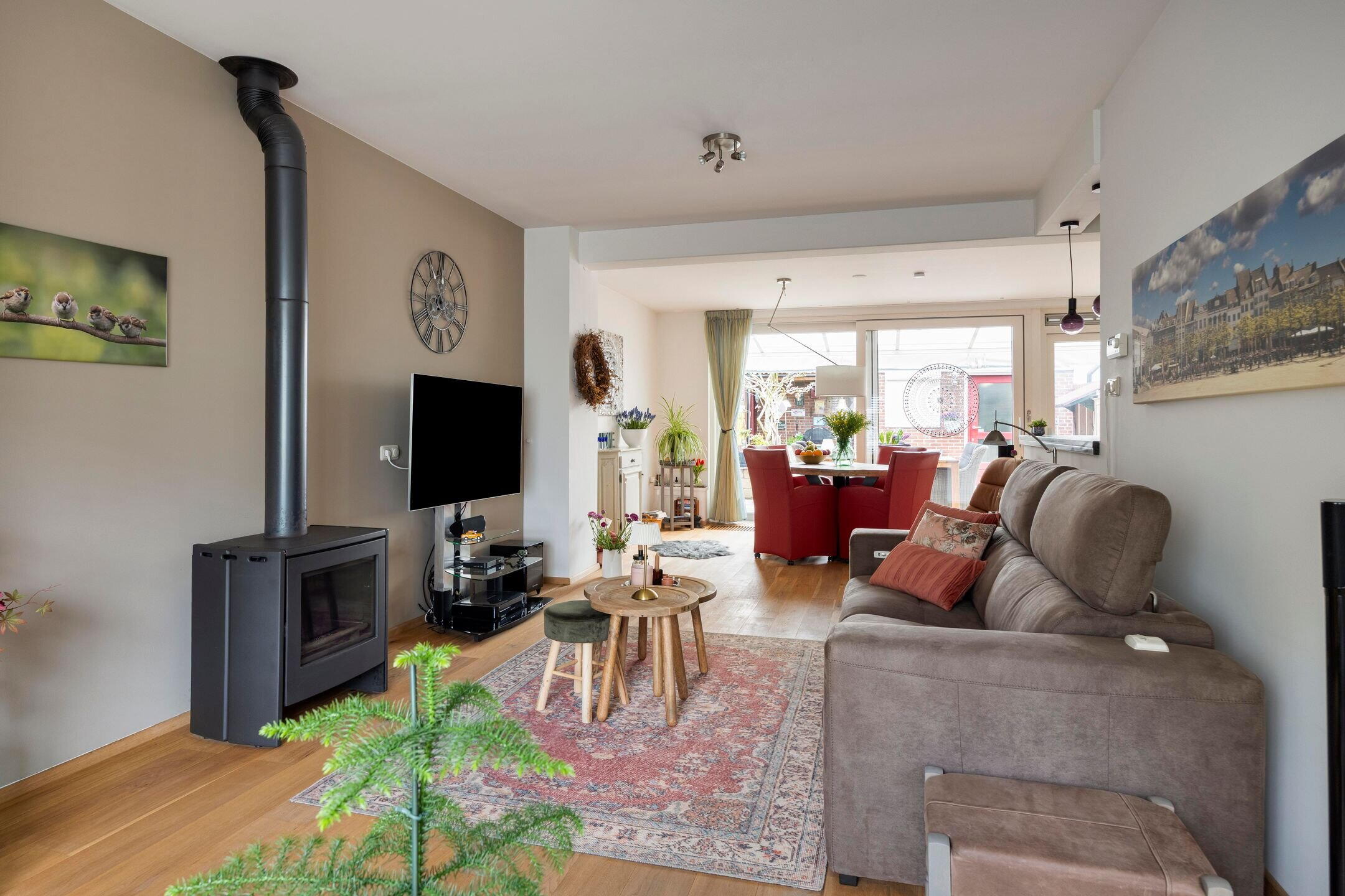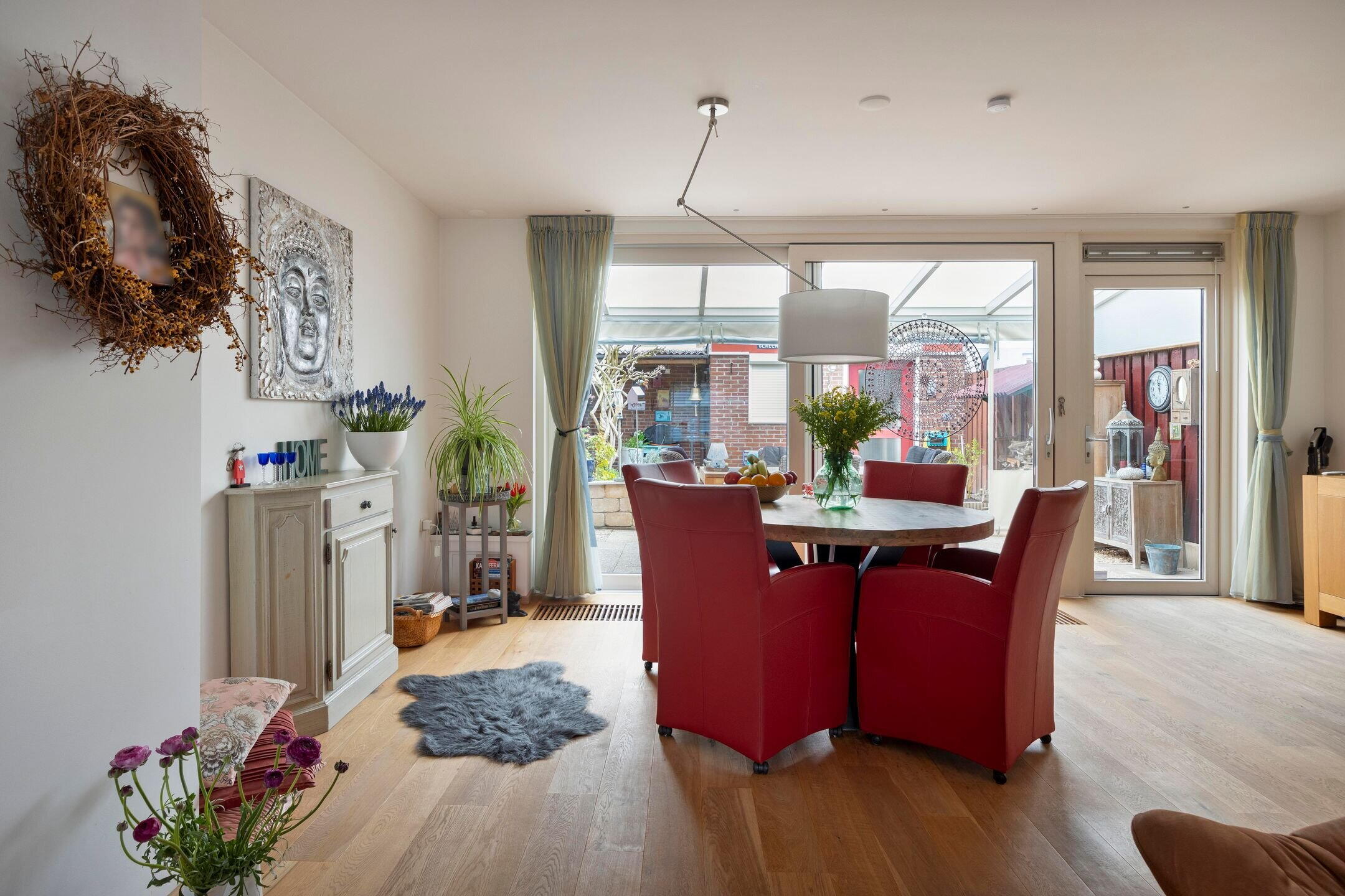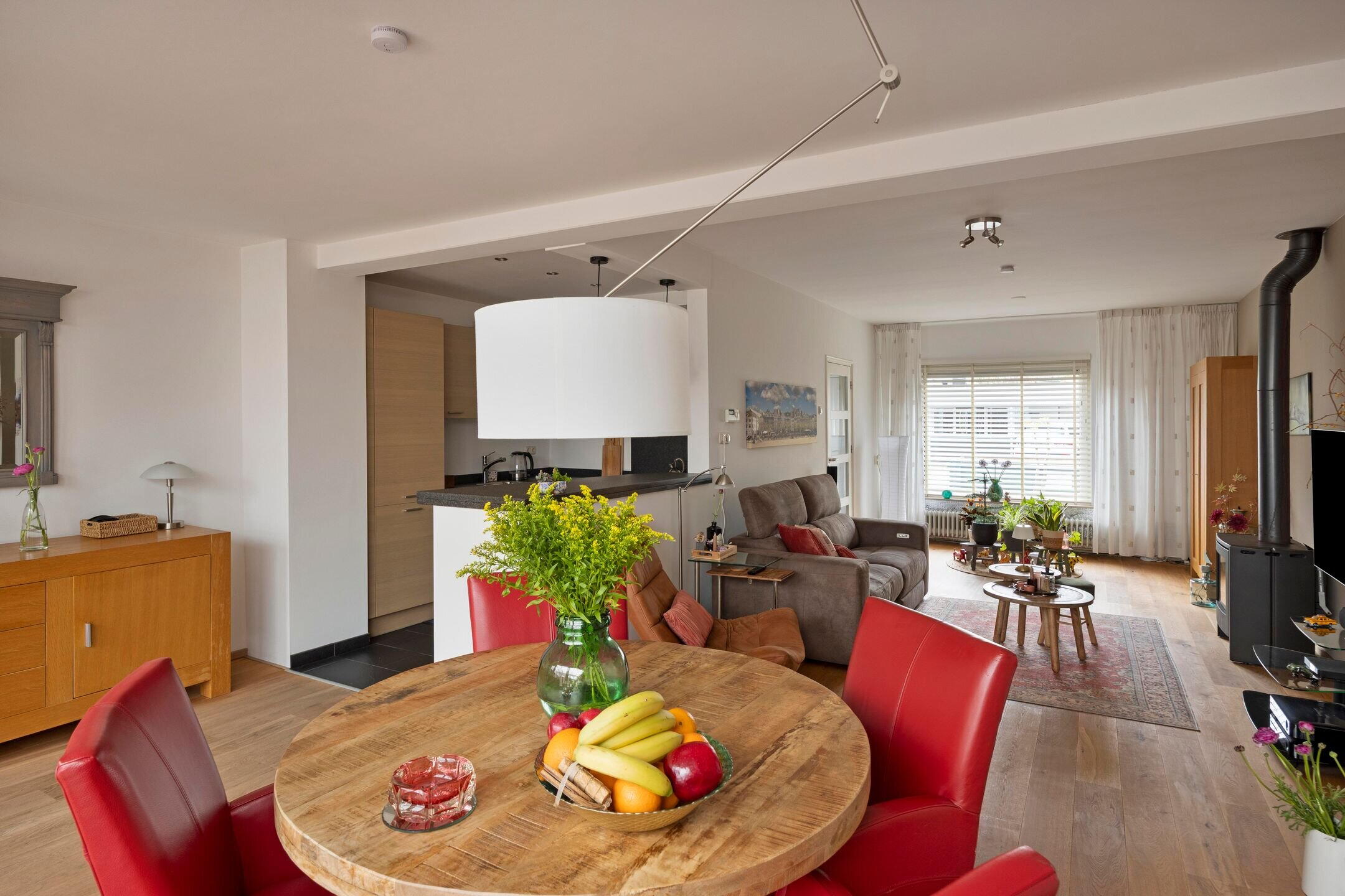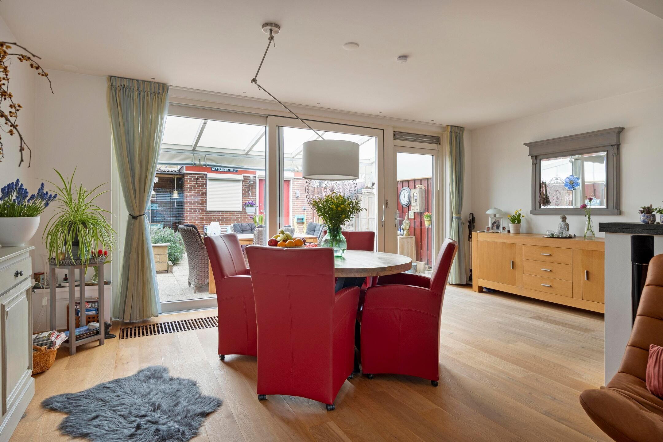 De woonkamer is aan de achterzijde uitgebouwd, over de hele breedte van het huis. Sfeermakers zijn de houten vloer en de houtkachel bij het zitgedeelte. Vanaf de bank kijk je niet alleen naar de tv en het vlammenspel in de haard, maar ook naar de rustige straat. Het eetgedeelte, met een deur en een schuifpui naar de tuin, heeft een zeer ruime opzet.