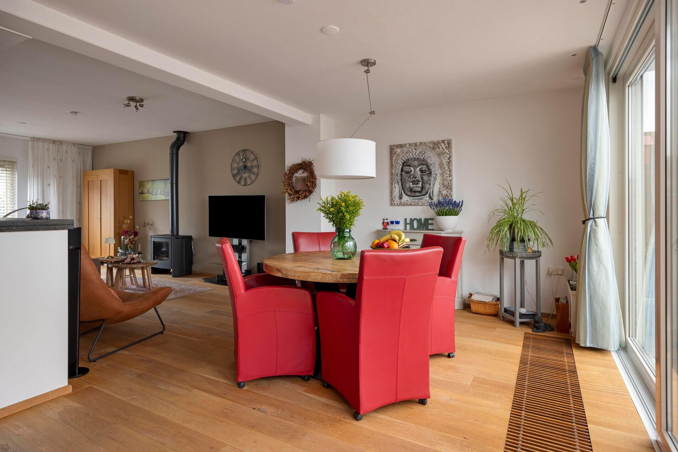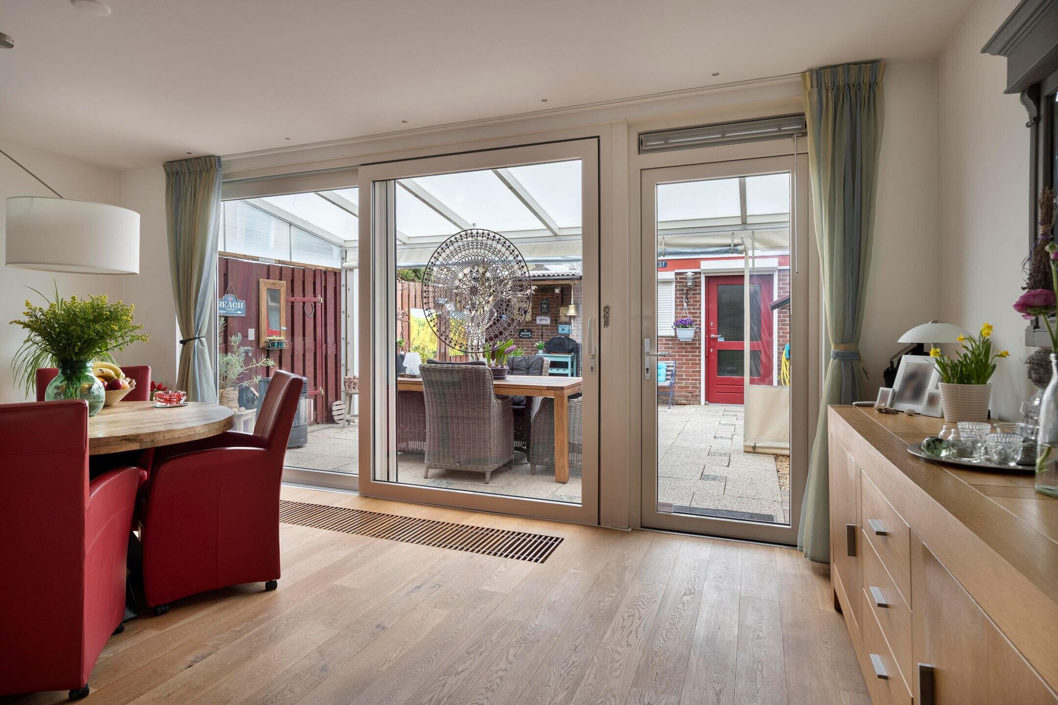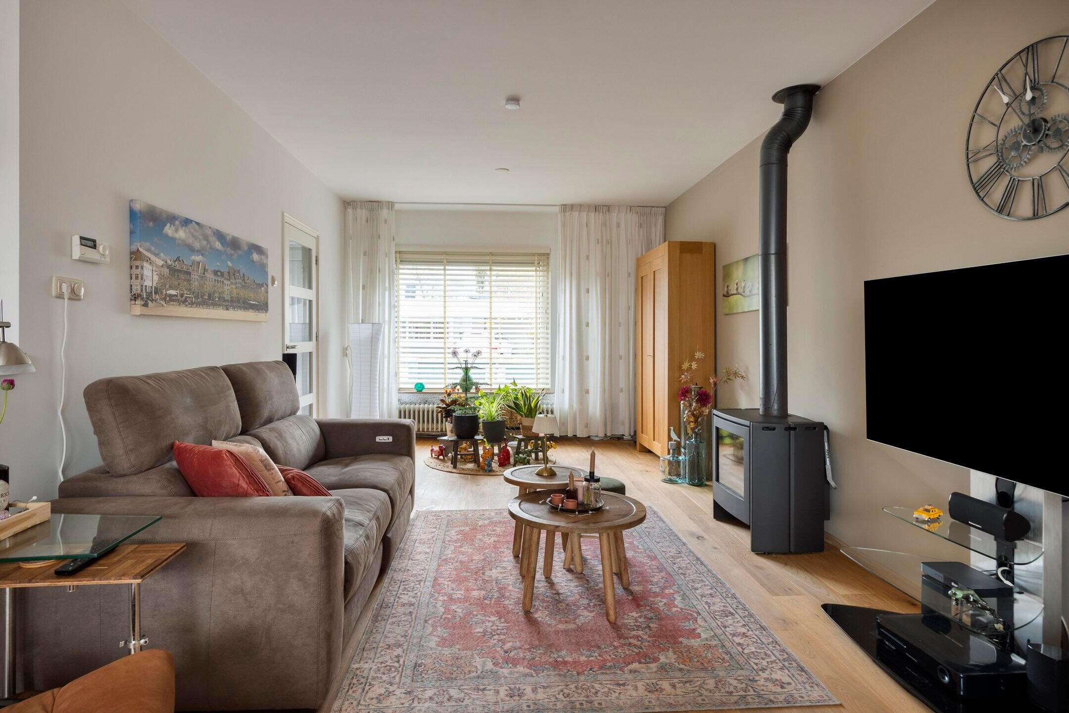 De woonkamer is aan de achterzijde uitgebouwd, over de hele breedte van het huis. Sfeermakers zijn de houten vloer en de houtkachel bij het zitgedeelte. Vanaf de bank kijk je niet alleen naar de tv en het vlammenspel in de haard, maar ook naar de rustige straat. Het eetgedeelte, met een deur en een schuifpui naar de tuin, heeft een zeer ruime opzet.