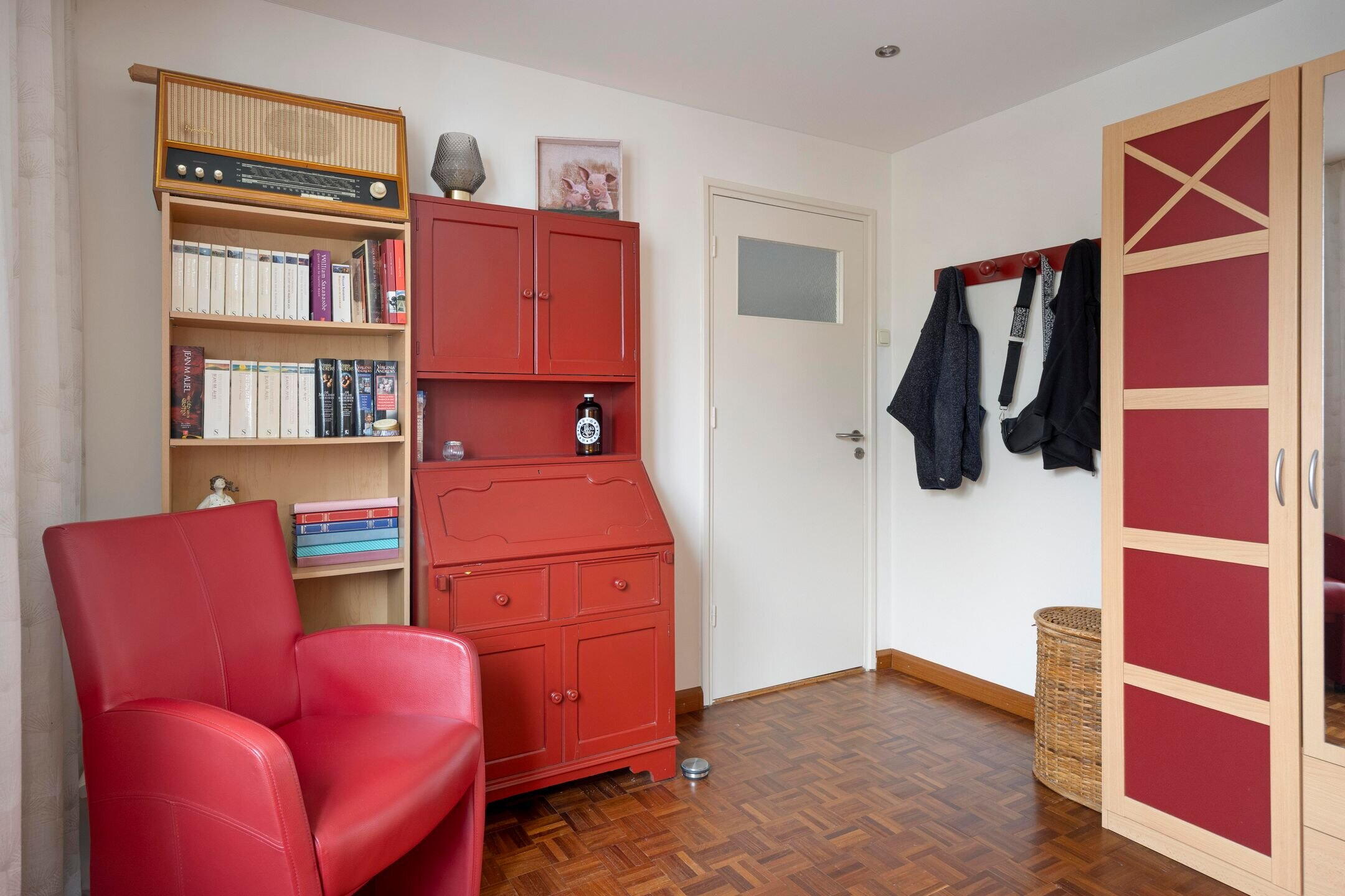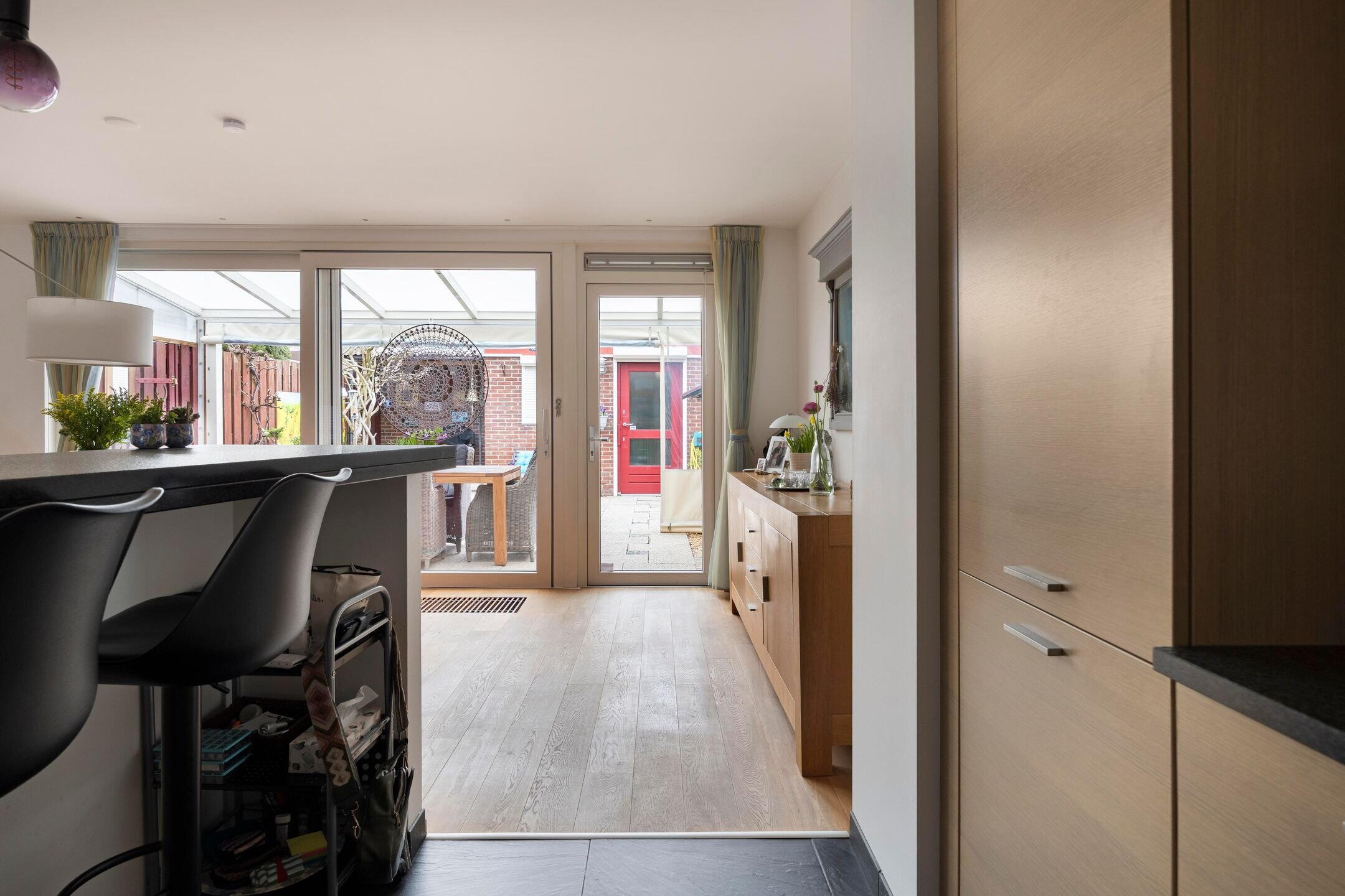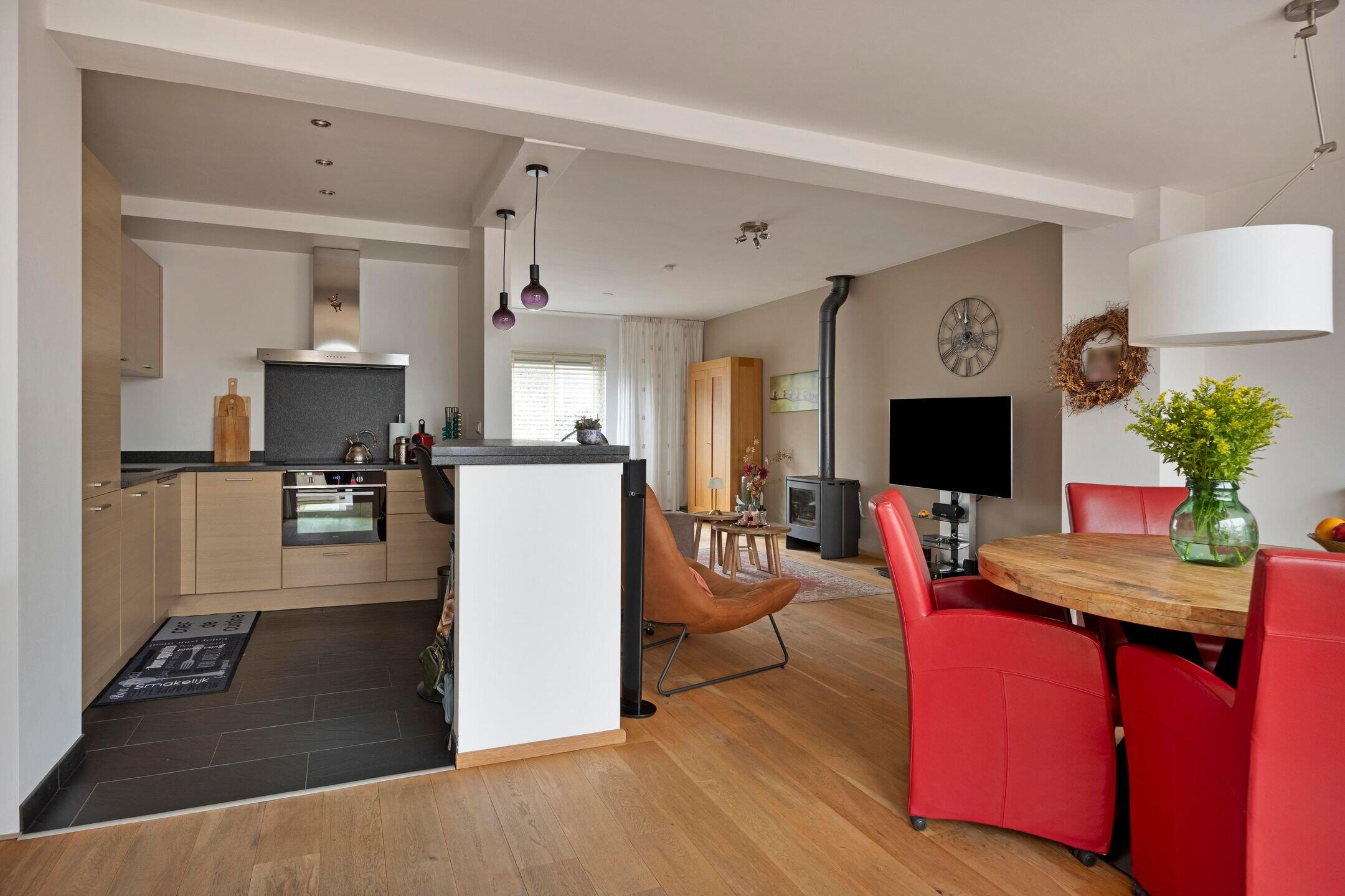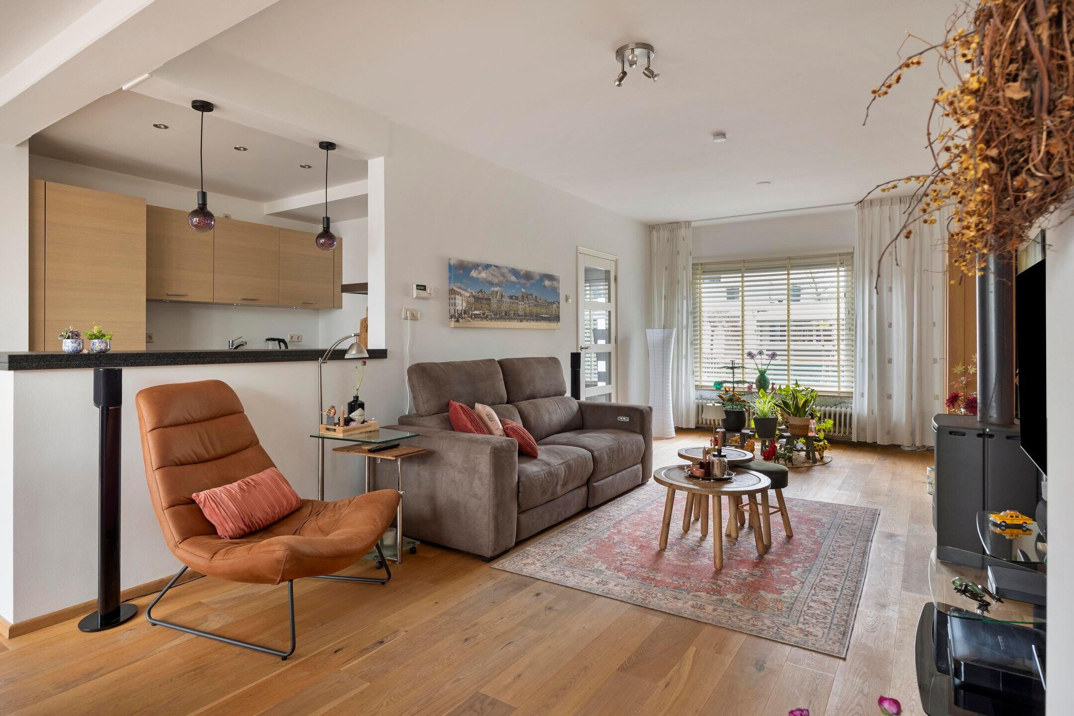De woonkamer is aan de achterzijde uitgebouwd, over de hele breedte van het huis. Sfeermakers zijn de houten vloer en de houtkachel bij het zitgedeelte. Vanaf de bank kijk je niet alleen naar de tv en het vlammenspel in de haard, maar ook naar de rustige straat. Het eetgedeelte, met een deur en een schuifpui naar de tuin, heeft een zeer ruime opzet.