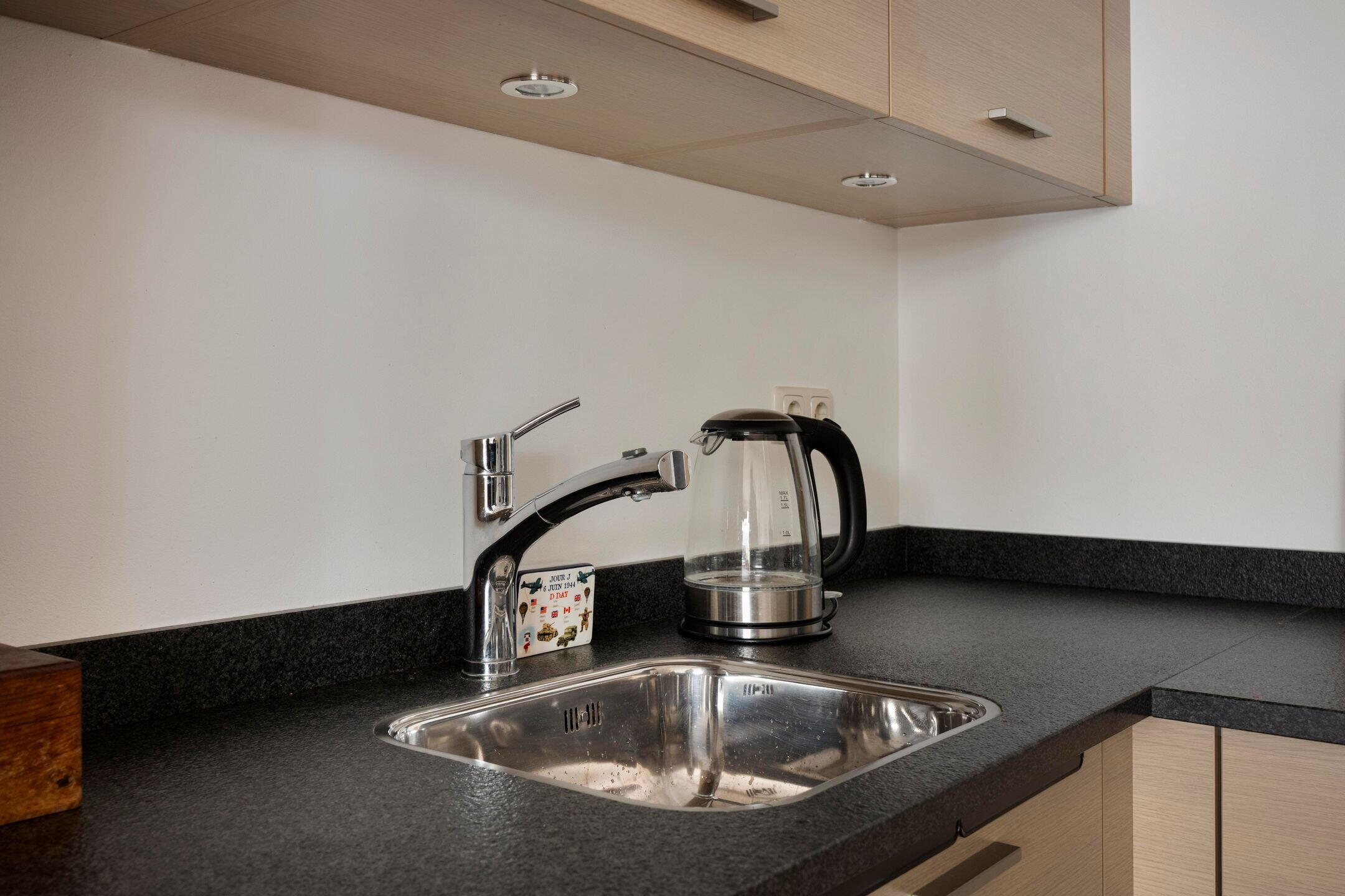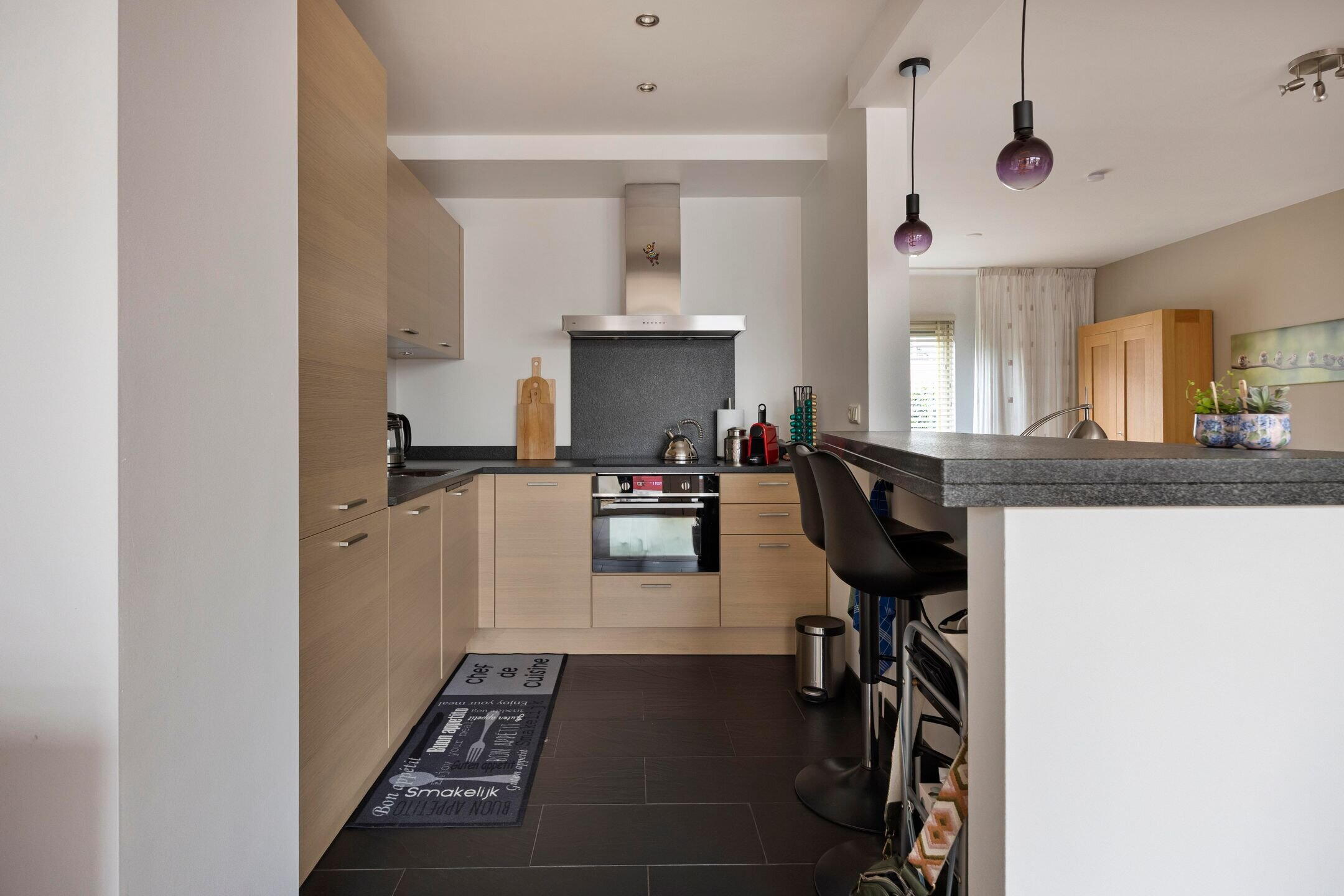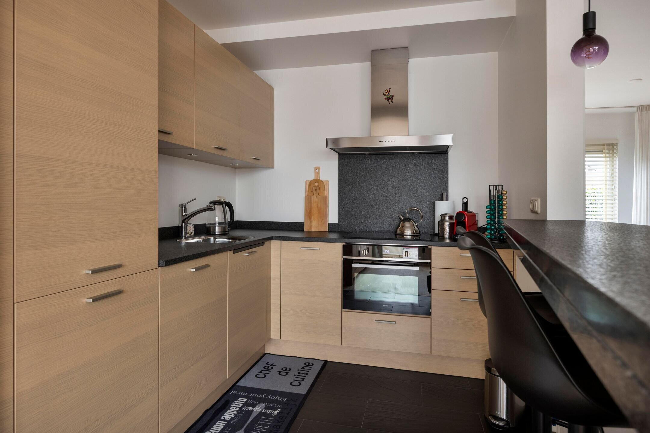 In de open keuken is op het halfhoge muurtje een blad geplaatst, waardoor er aan de keukenzijde zitgelegenheid voor twee personen is. Fraaie elementen zijn de tegelvloer, het aanrechtblad en de achterwand bij het kookgedeelte. De L-vormige keukenopstelling heeft een ingebouwde keramische kookplaat, afzuigkap, combi-oven, vaatwasser, koelkast en een vriezer.