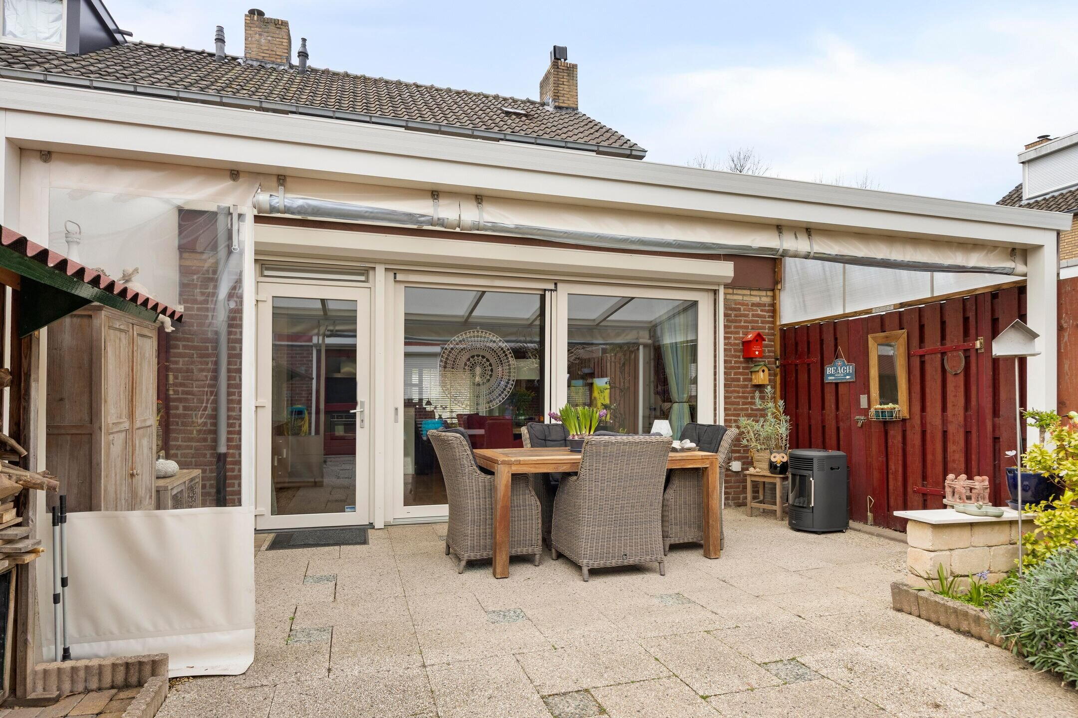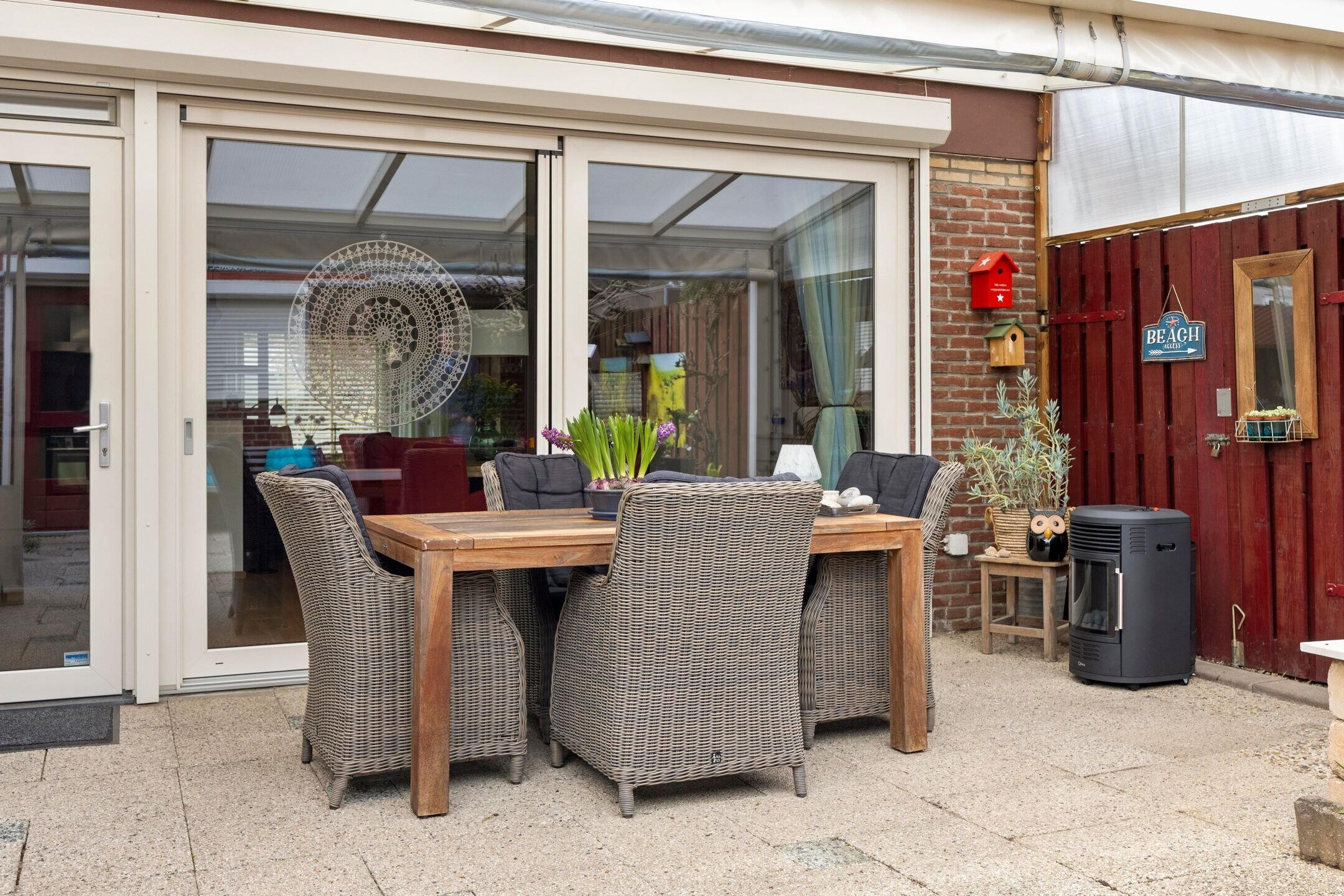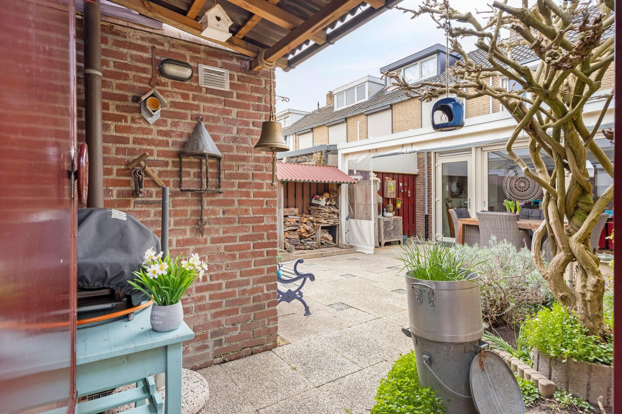 Vanuit de woonkamer loop je naar het bijna 6 meter brede, overdekte terras in de achtertuin. Een groot deel van de tuin is bestraat, er is een poort naar de steeg en de ligging op het oosten biedt zon gedurende een groot deel van de dag. In de tuin staat een ruime berging, voor de fiets en andere spullen. Water en elektra zijn aanwezig, net als de aansluitingen voor de wasmachine en droger.