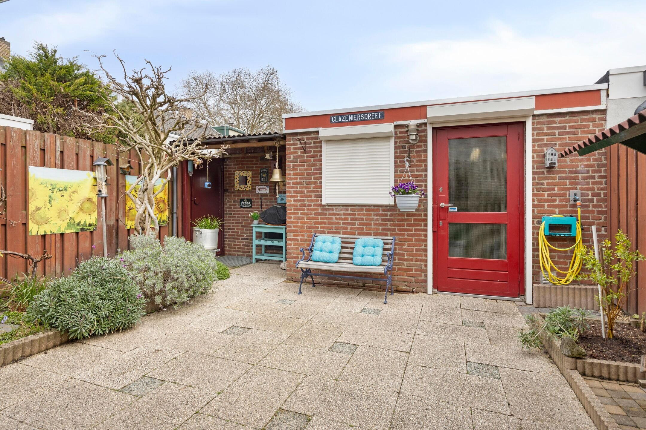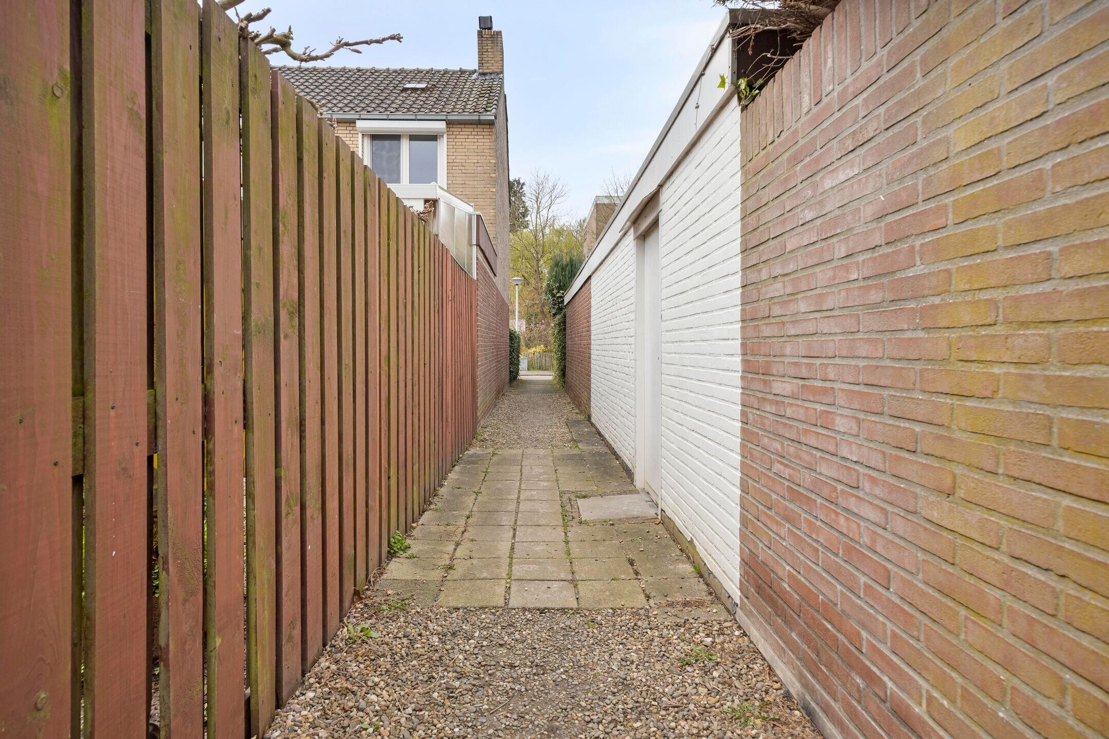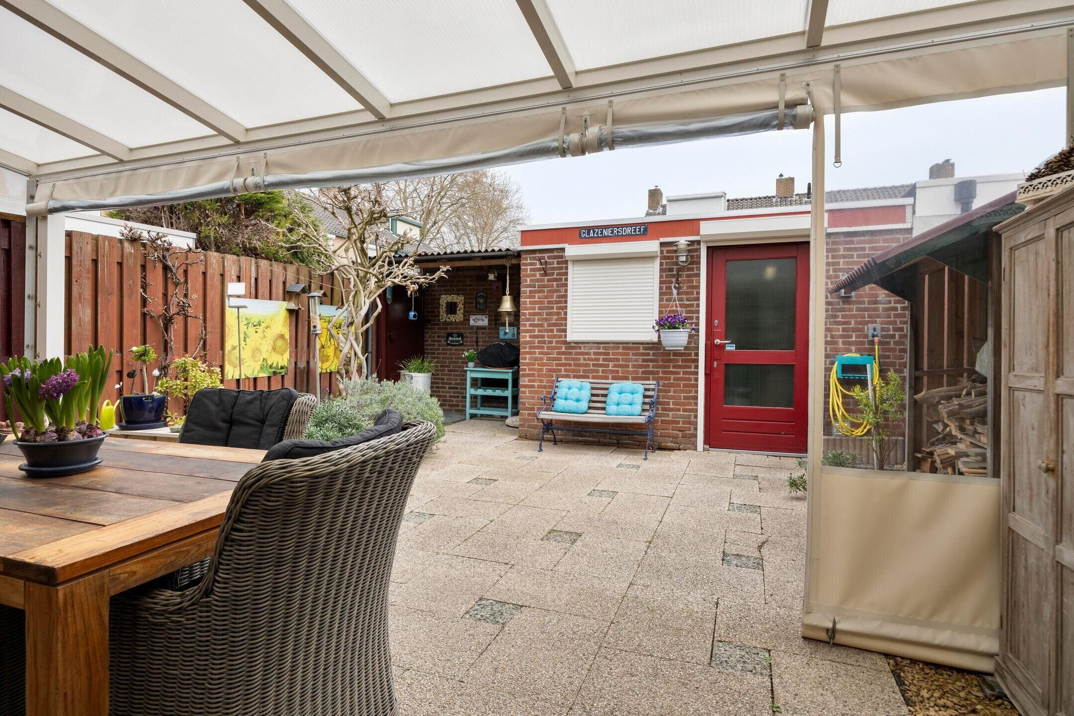 Vanuit de woonkamer loop je naar het bijna 6 meter brede, overdekte terras in de achtertuin. Een groot deel van de tuin is bestraat, er is een poort naar de steeg en de ligging op het oosten biedt zon gedurende een groot deel van de dag. In de tuin staat een ruime berging, voor de fiets en andere spullen. Water en elektra zijn aanwezig, net als de aansluitingen voor de wasmachine en droger.