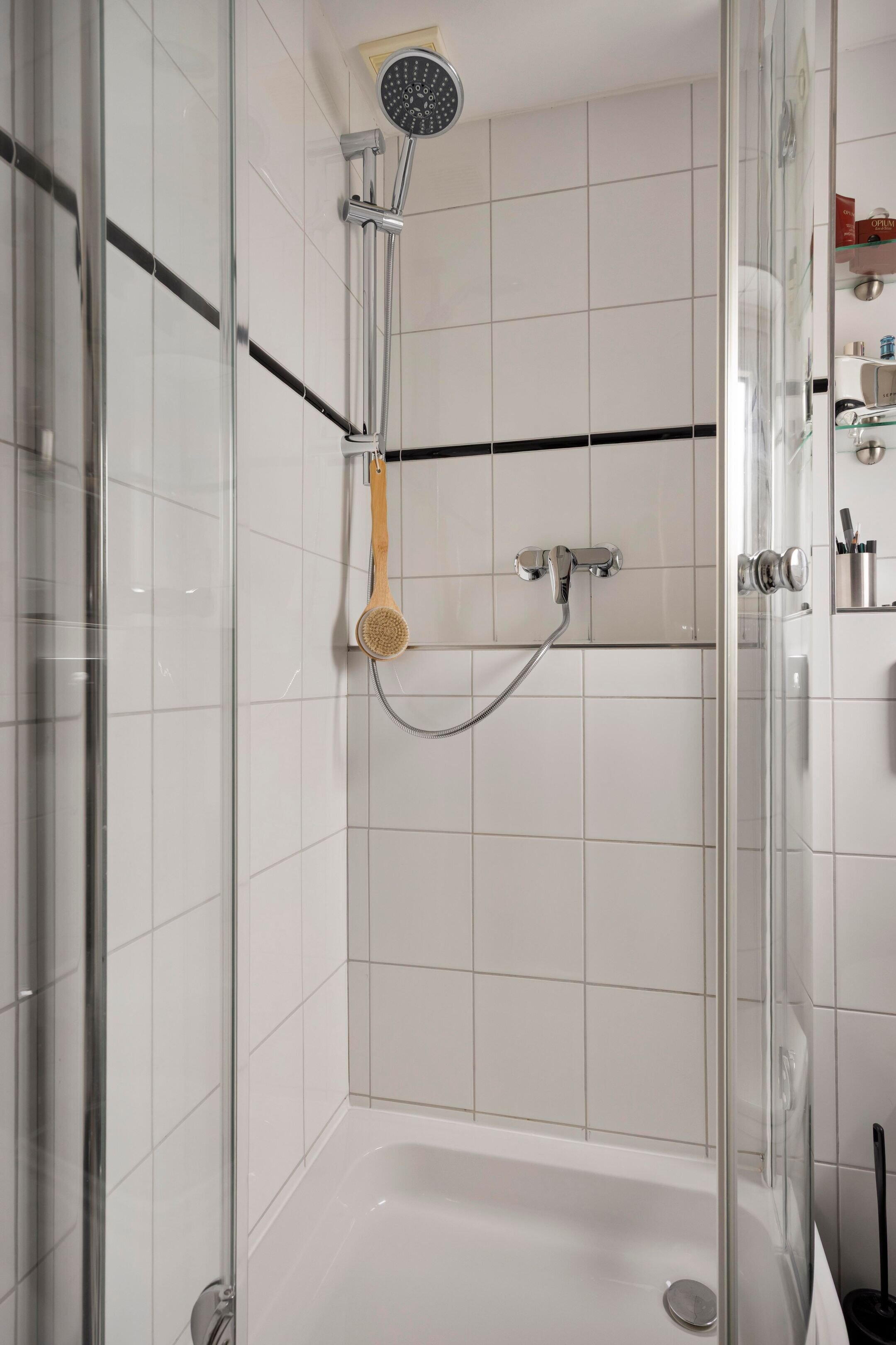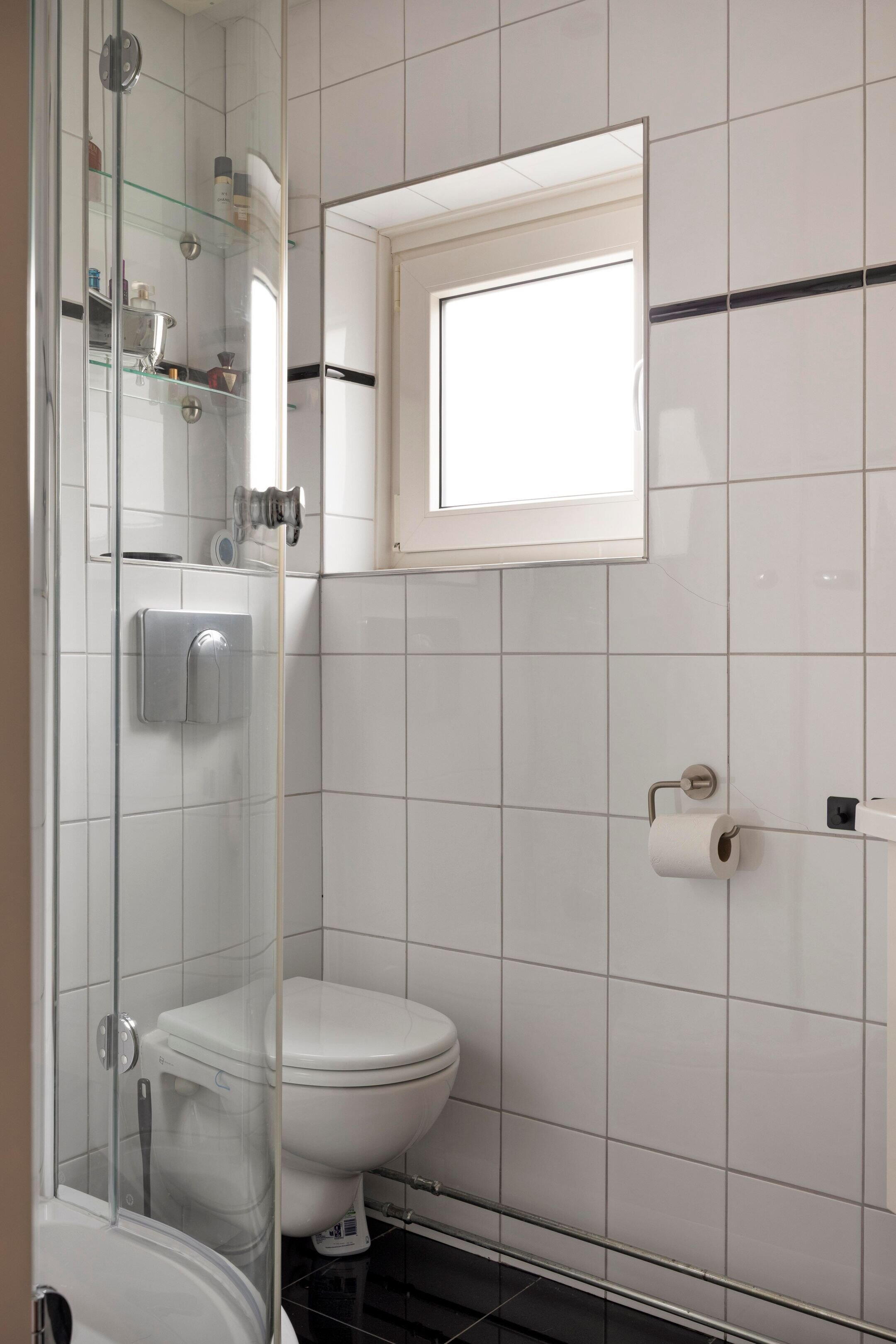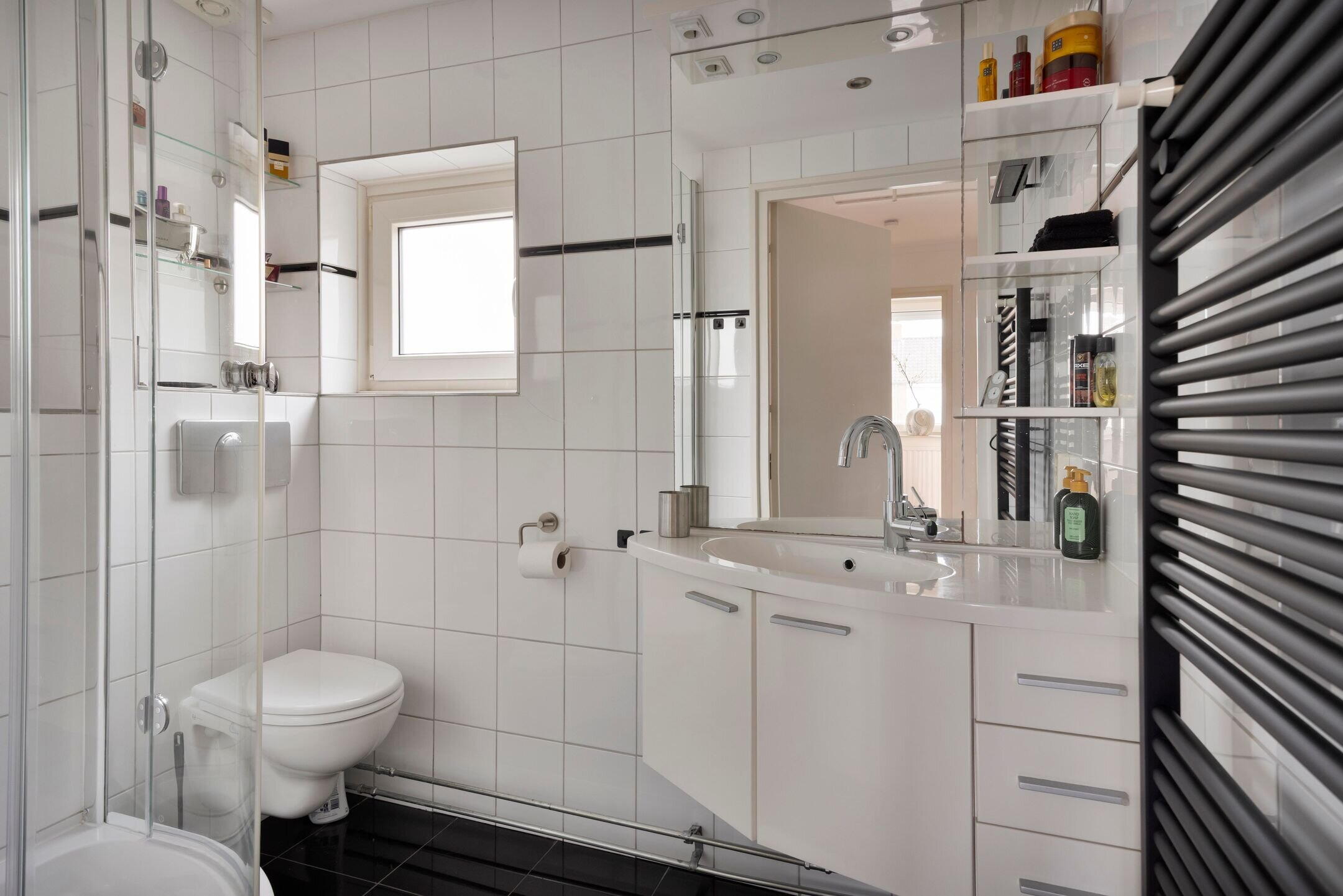 De badkamer, uitgevoerd in wit en zwart, heeft prettige lichtinval en een optimale indeling. Het wastafelmeubel biedt veel bergruimte, het toilet is uitgevoerd als wandcloset en de kwartronde douche heeft twee glazen deuren voor een goede toegang.